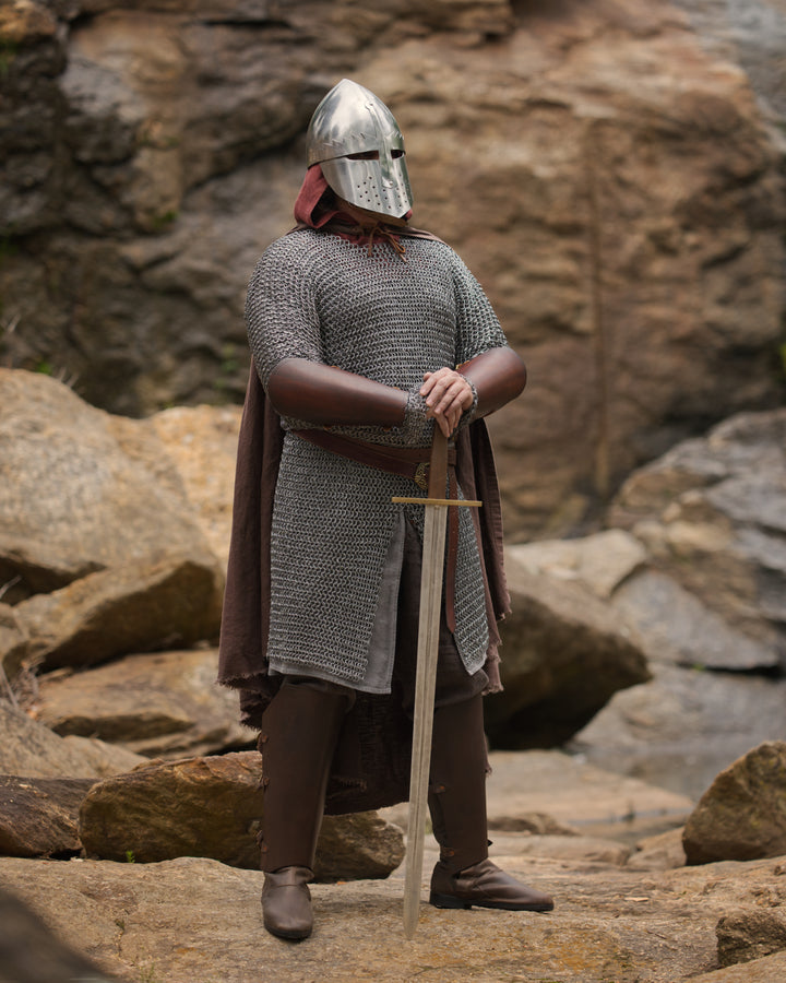An absolute quality piece of reenactment and LARP wargear. Riveted maile is so essential for authenticity, and the hauberk from Fell & Fair exceeds the expectations. Darkened on one side, you can reverse it for a cleaner look, but the dark, battle-worn look is too good to pass up! An investment WELL worth the cost!