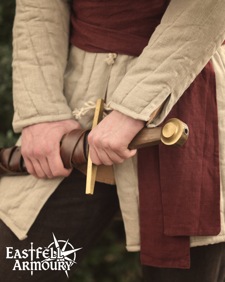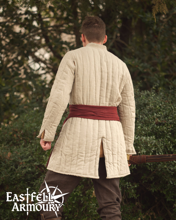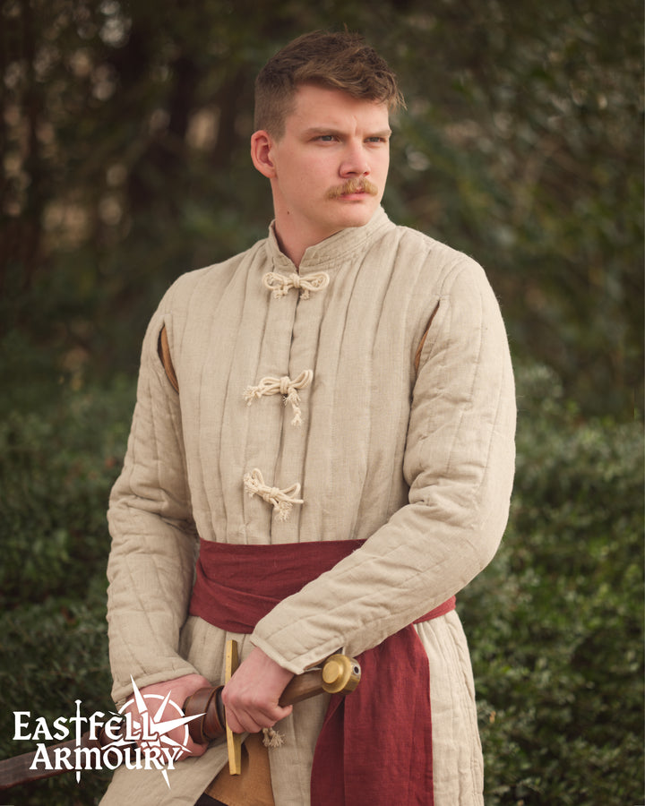Crafted from 100% Linen fabric and wool batting, each gambeson features robust padding designed to absorb blows while maintaining mobility and grace. Adjustable ties ensure a customizable fit, letting you move freely whether you're wielding a blade, bending a bow, or gathering around the evening campfire.