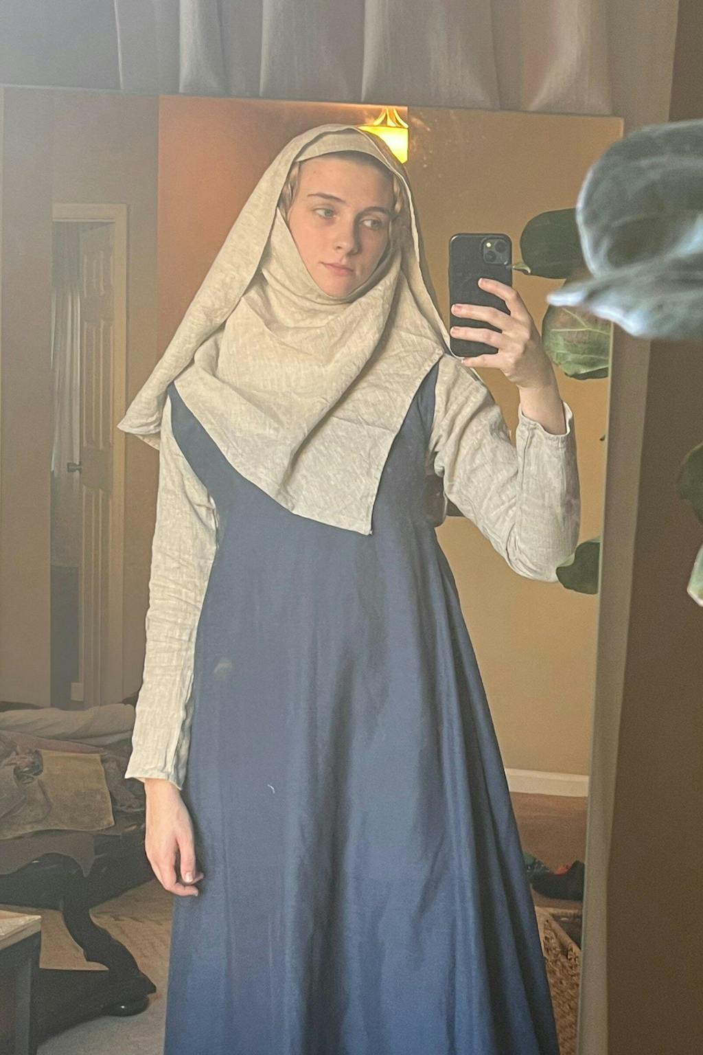 Whether you're a farmer's daughter, a nun, or a lady-in-waiting, our veil and wimple set is the perfect touch to add a historic flair to your medieval outfit! The veil comes pre-attached to a fillet or headband to help secure it in place. The set also comes with four medieval-style brass pins to fasten the wimple and drape the veil.